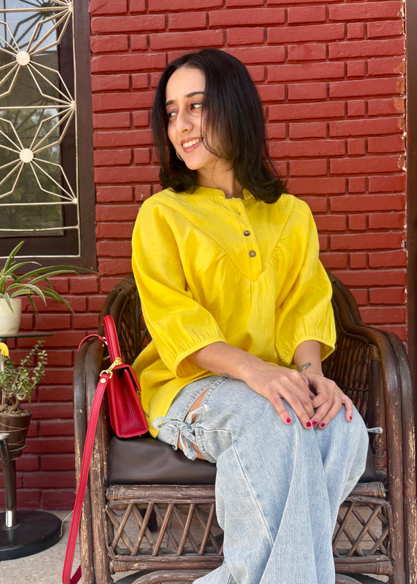 Yellow Cotton Linen Top woth Wooden Buttons