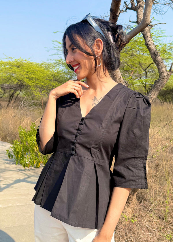 Black Cotton - Poplin Top with Puff Sleeves
