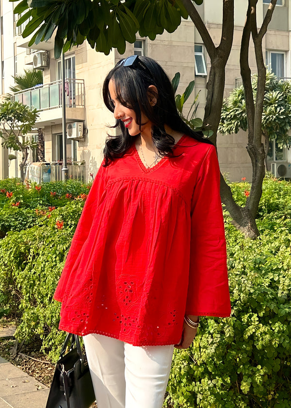 Red Cotton Schiffli A - Line Empire Top