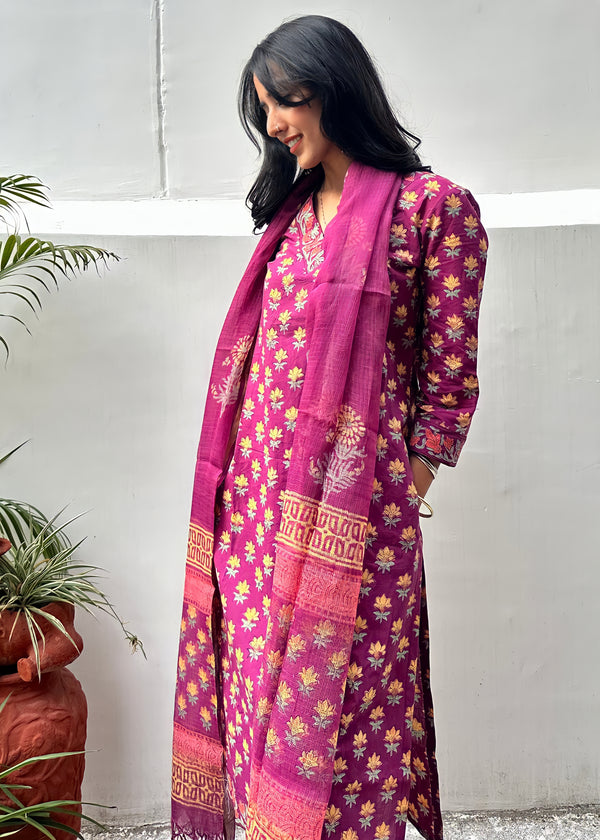Purple Cotton Block Print Suit & Kota Doria Dupatta