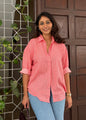 Crafted from buttery-soft rayon fabric, it drapes beautifully while keeping you cool and comfortable all day long. The oversized silhouette, rounded hem, and classic button-down front give it a relaxed yet refined look, while the pink and white stripes add a fresh, feminine touch.