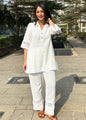 A charming straight-fit notch collar cotton-flex kurta with wooden buttons and lace detailing, paired with coordinating cotton pants perfect for laid-back days or a day out and about!